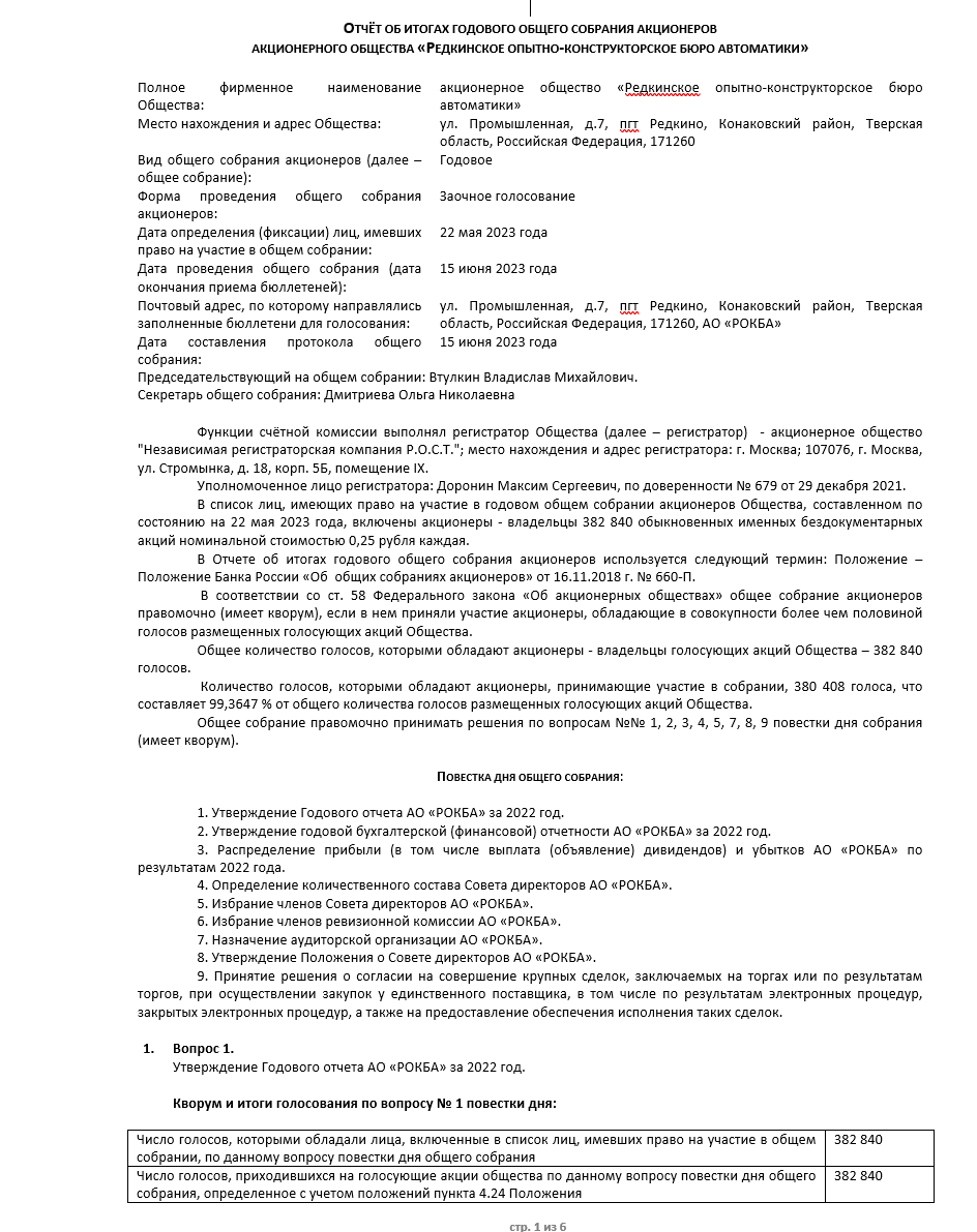 Акционерное общество «Редкинское опытно-конструкторское бюро автоматики» (место нахождения: ул. Промышленная, д.7, пгт Редкино, Конаковский район, Тверская область, Российская Федерация, 171260) сообщает, что в соответствии со статьей 3 Федерального закона Российской Федерации от 25.02.2022 N 25-ФЗ годовое Общее собрание акционеров Общества будет проведено в форме заочного голосования со следующей повесткой дня: