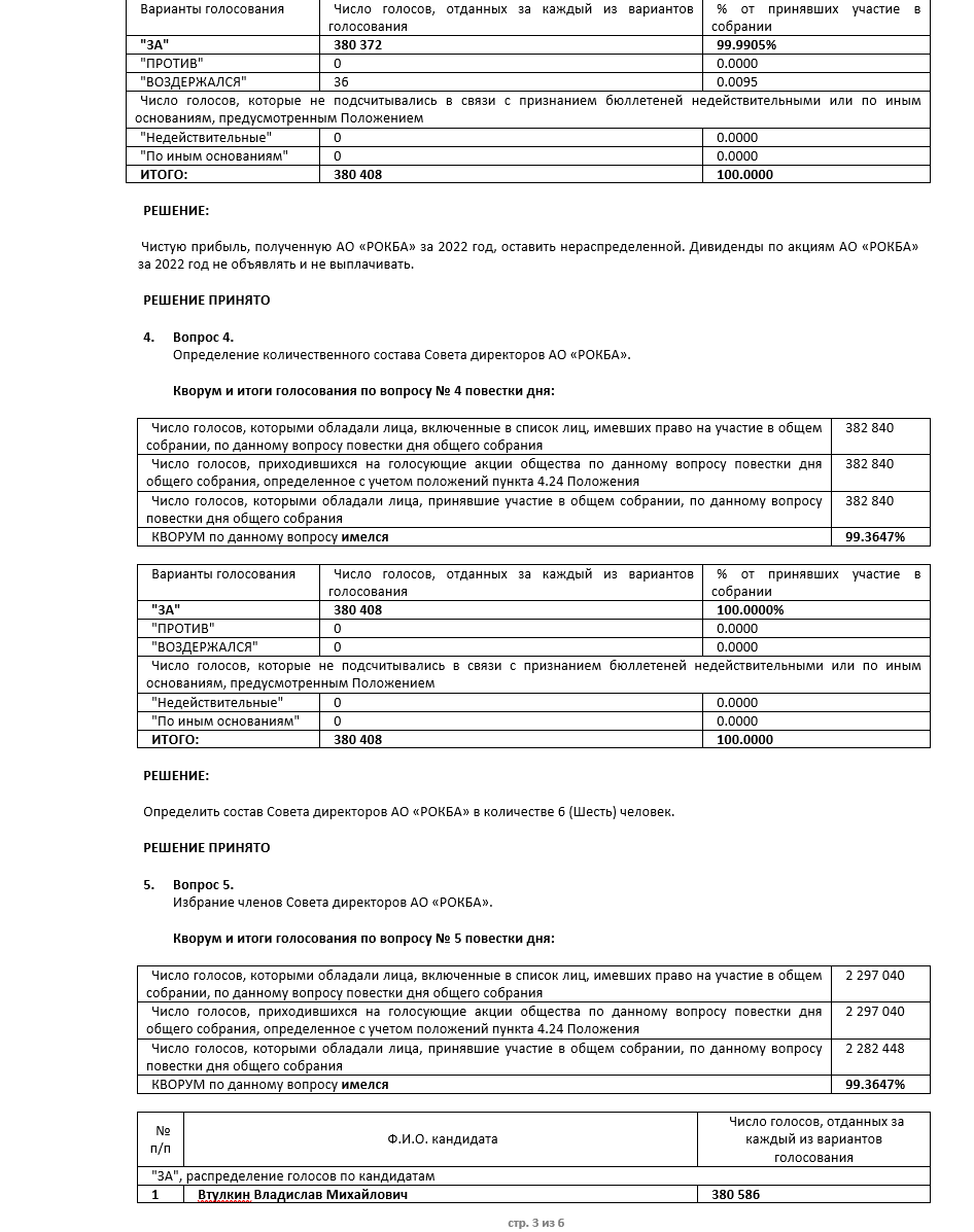 3. Распределение прибыли (в том числе выплата (объявление) дивидендов) и убытков АО «РОКБА» по результатам 2022 года.