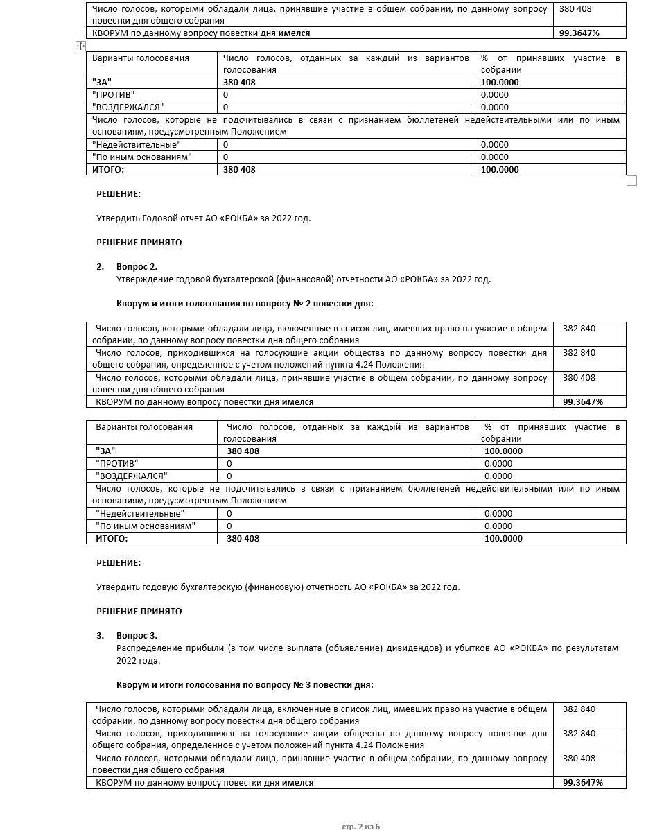 Принявшими участие в общем собрании акционеров, проводимом в форме заочного голосования, считаются акционеры, бюллетени которых получены до даты окончания приема бюллетеней, - заполненный бюллетень должен поступить в АО «РОКБА» не позднее 14 июня 2023 года.